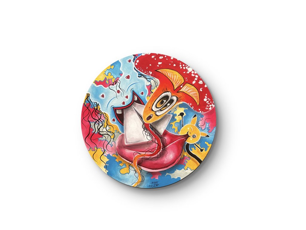 Tento obraz vznikl ze zvědavosti. Nikdy jsem na kulaté plátno nemalovala a chtěla jsem to zkusit. Houby vznikaly v procesu malování. Ladila jsem to tak, aby se tyto happy mushrooms hodily ke kulatému plátnu a bylo to hravé a veselé.